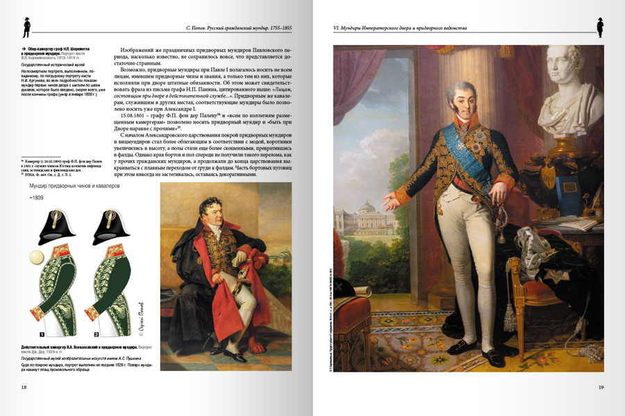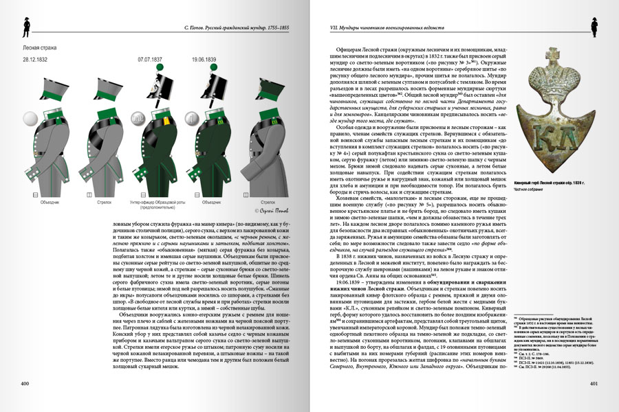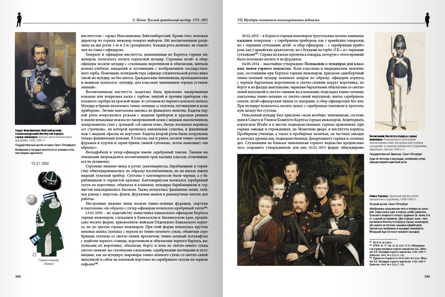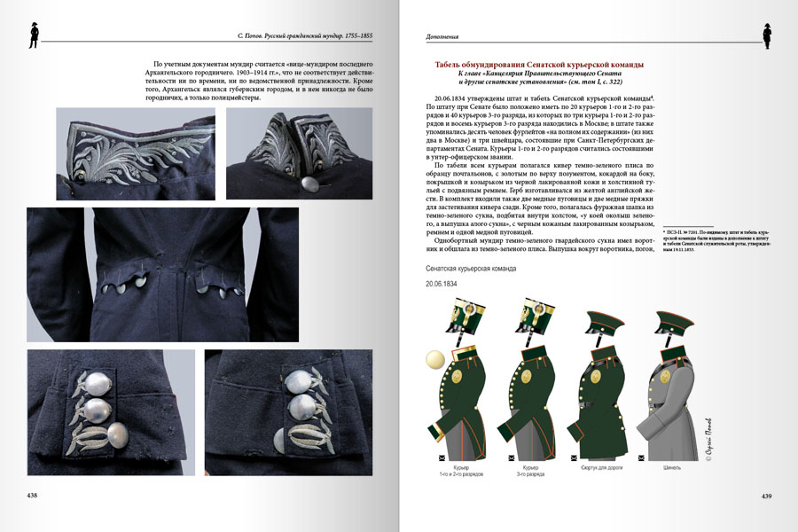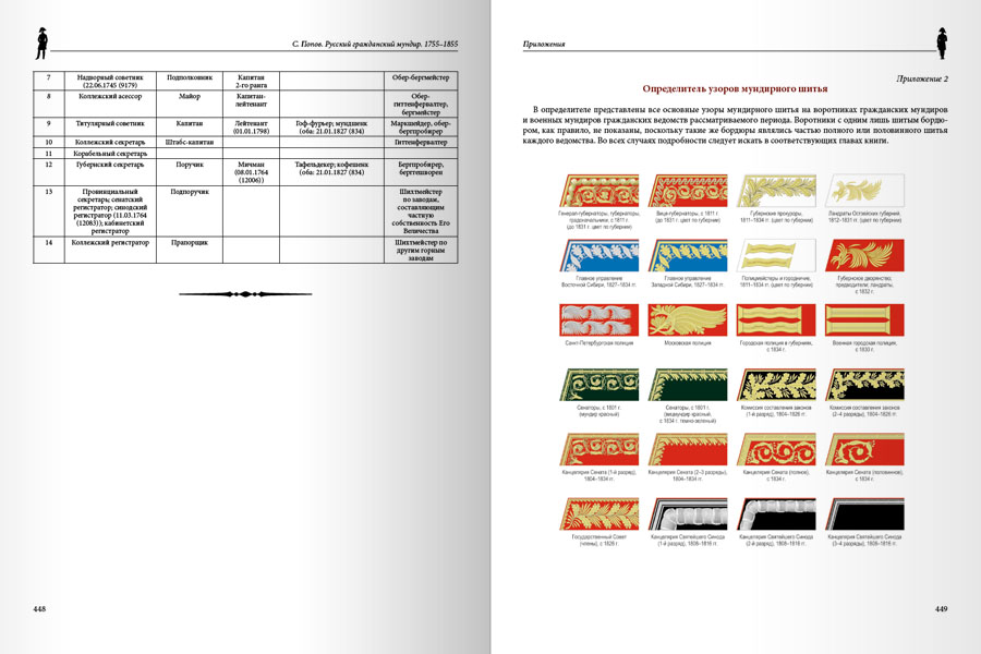 Книга посвящена истории гражданских мундиров в Российской империи в период их возникновения и регламентации во второй половине XVIII и первой половине XIX века. Издание представляет собой подробный справочник, подготовленный на основе анализа законодательных источников, архивных материалов и мемуаров современников. Впервые сведения о русских гражданских мундирах приводятся в наиболее полном и систематизированном виде. Текст книги подробно проиллюстрирован образцовыми рисунками, авторскими схематическими рисунками мундиров и шитья, историческими портретами чиновников в форменной одежде и другими изображениями.