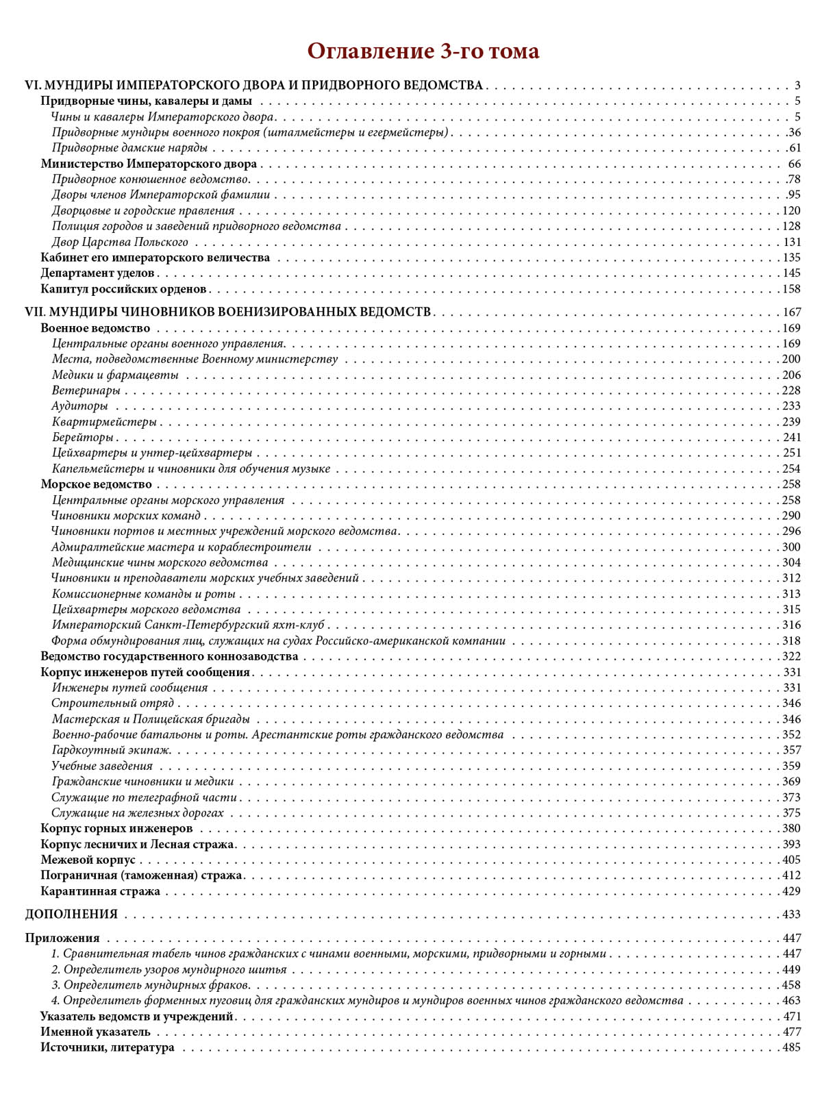 Третий, заключительный том издания посвящен форменной одежде чинов Императорского двора, придворных кавалеров и дам, классных чиновников придворного, военного и морского ведомств и служащих военизированных формирований гражданского ведомства. В заключении приведены определители узоров шитья, мундирных фраков и форменных пуговиц, а также справочный аппарат ко всему изданию.